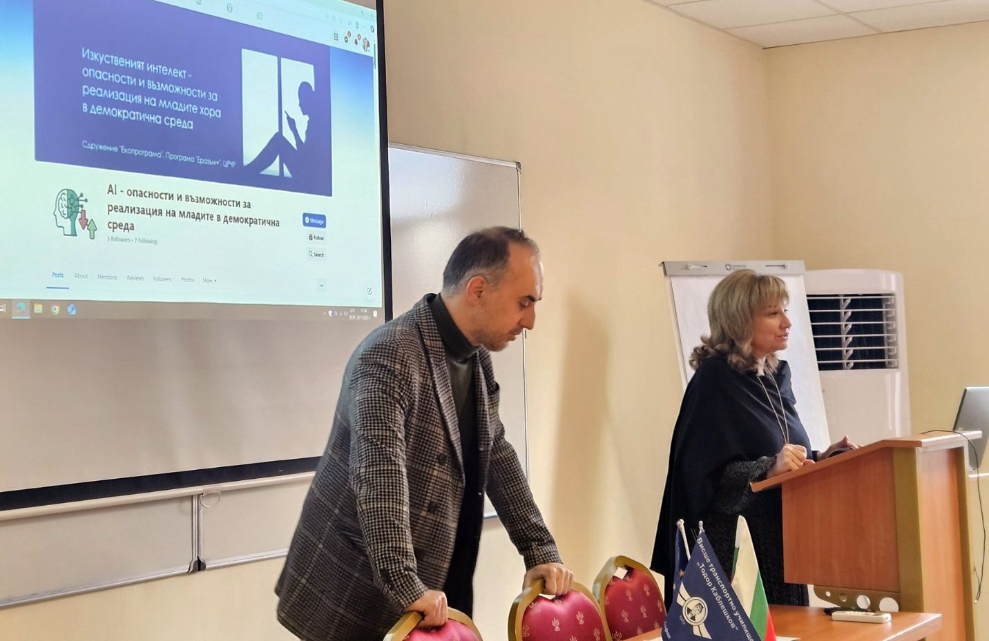 Сдружение „Екопрограма“ проведе финалното си обучение по проекта „Изкуственият интелект – опасности и възможности за реализация на младите хора в демократична среда“. Домакин на събитието беше Висшето транспортно училище "Тодор Каблешков" в София. Инициативата се реализира с подкрепата на програма „Еразъм+“иЦентъра за развитие на човешките ресурси (ЦРЧР), както и със съдействието на екипа на ВУЗ-а.