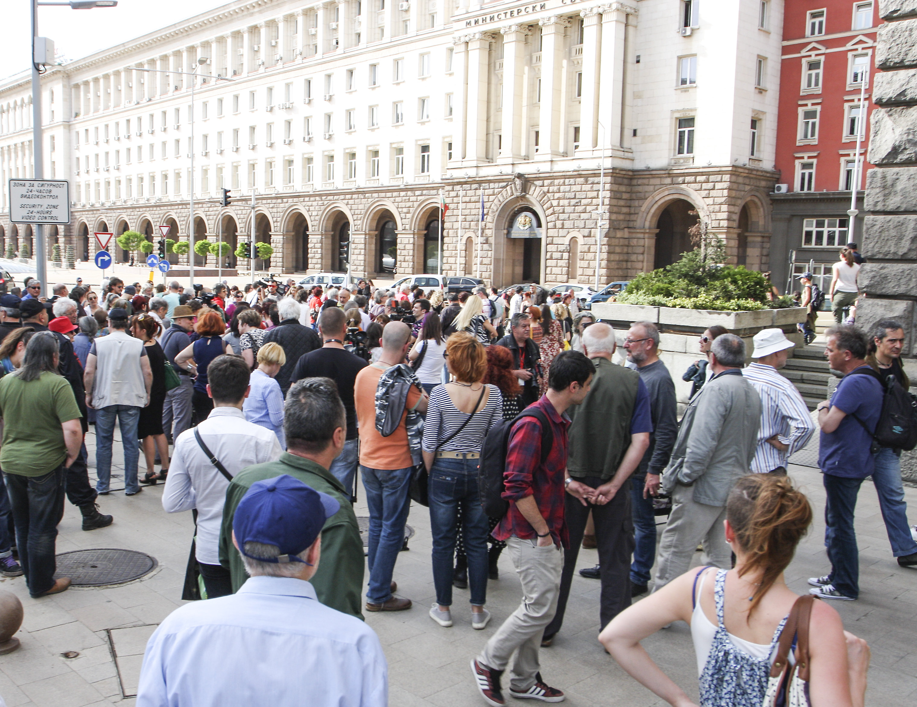 Културните дейци излезнаха на протест пред Министерския съвет вчера. Под наслов Да спрем унищожаването на българската култура, те настояват за законови промени в областта на културата и изкуството. Сред конкретните им искания е промяна в начина на финансиране на театрите. Сега финансирането е на база приход от продаден билет, а това обрича трупите на държавните културни институти – те трябва да бъдат разпуснати и превърнати в открити сцени. Протестът на културните дейци е организиран от Гражданската инициатива Българска култура. Творците искат незабавно изпълнение на Закона за хазарта, който изисква 10 на сто от събраните такси от всички залагания да бъдат насочени към Националния фонд Култура. По думите на председателя на гражданската инициатива Татяна Симеонова, нито един лев не е постъпил във фонда чрез отчисления от хазарта. Освен това, сред исканията на протестиращите са незабавни промени в Закона за меценатството и отмяна на правителственото постановление, което дава право на министъра на културата да преобразува 8 културни института.