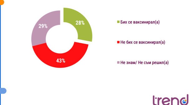 43% у нас не биха се ваксинирали срещу коронавирус, сочат данни от последното проучване на Тренд. Други 29% не знаят или още не са решили дали биха го направили. И само 28% от пълнолетните българи биха се ваксинирали.